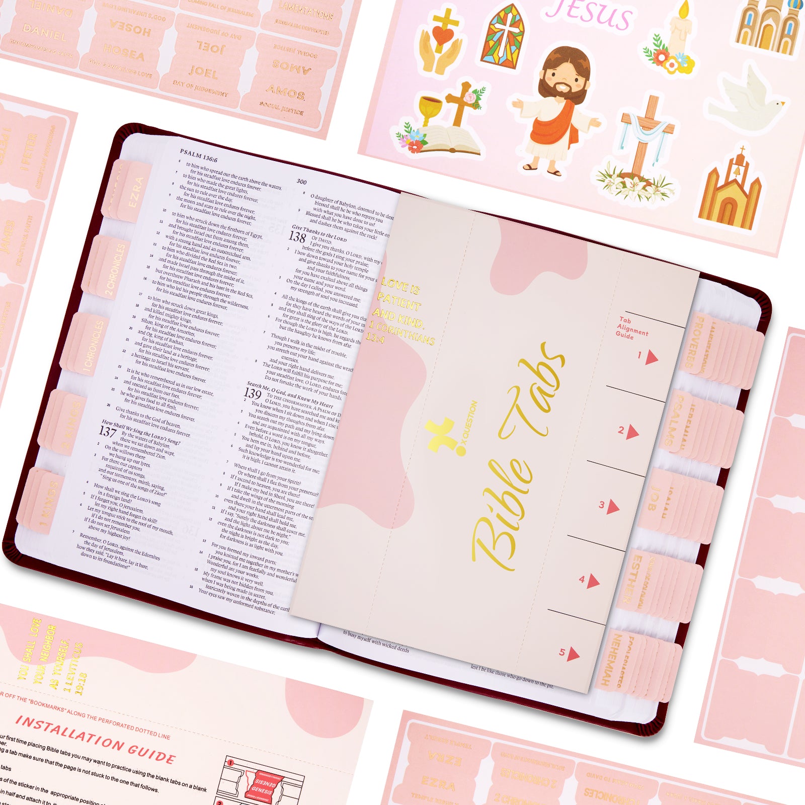 Stylish Gilding Cover:Gorgeous and perfectly fitting tab colors, this cover combines aesthetic appeal with great practicality –tear off along the dotted line on the cover, and you can get an instruction manual,an alignment guide and two bible verse bookmarks